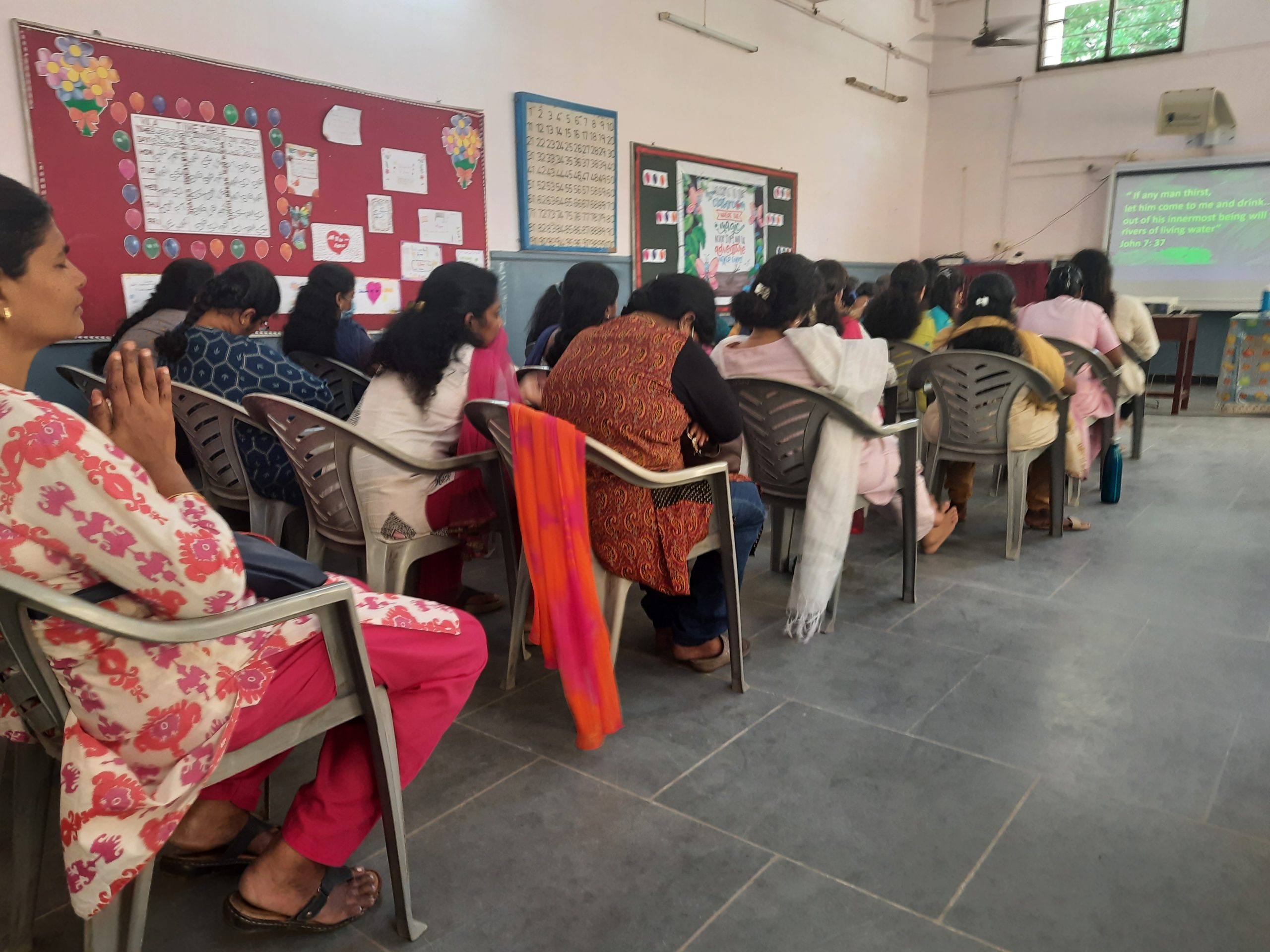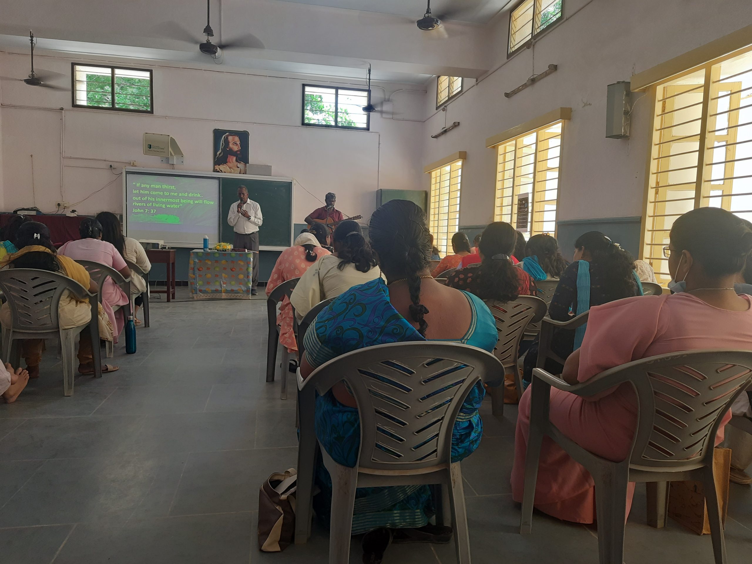 On a bright Sunny day, in a hall sat fifty five school teachers looking expectantly at the small team that stood in a circle, holding hands and praying quietly. They were curious about this small group consisting of a priest, adults and young people. The Team consisting of Fr. Paul, Babu, Rosy, Regina, Sharon. Robbie and Christie preached the Life in the Spirit Seminar to this group of teachers.